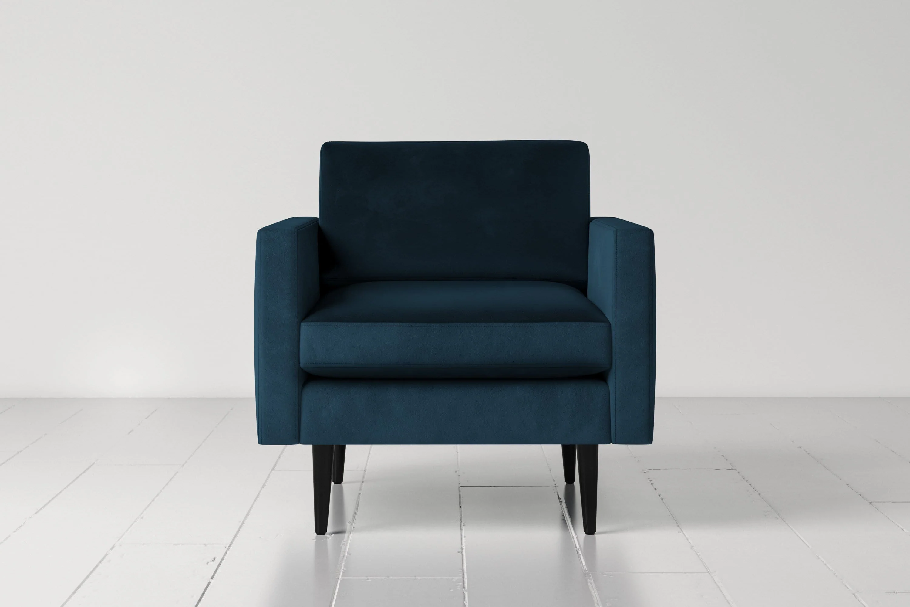 The Model 01 armchair boasts clean lines and a contemporary edge. It's a mid-century armchair, delivered in a box, with a variety of fabric colours to choose from.