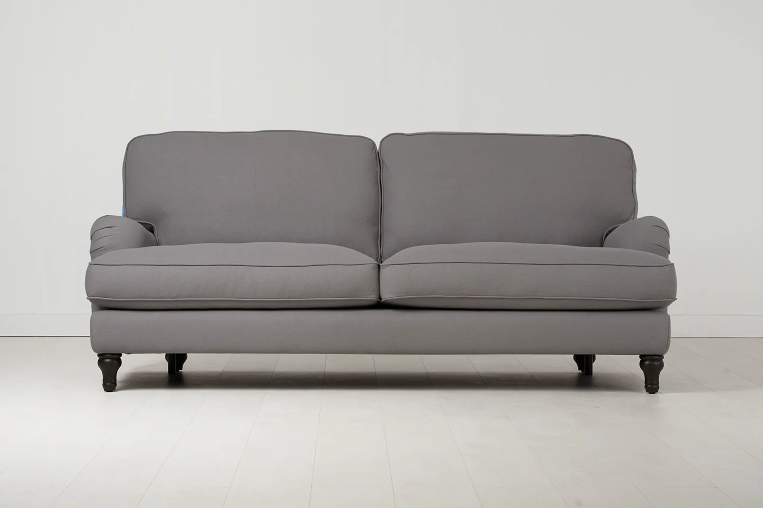 The heritage-style Model 15 3-seater sofa brings deep comfort with a high back, pleated arms, piped cushions, easy tool-free setup, and solid wooden legs.