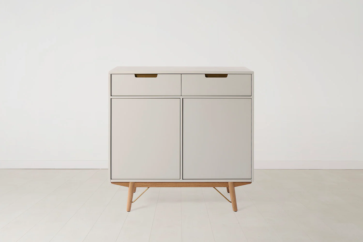 This modern sideboard features brass accents, two soft close drawers, solid white oak legs and comes fully assembled, bringing style and storage to your home.