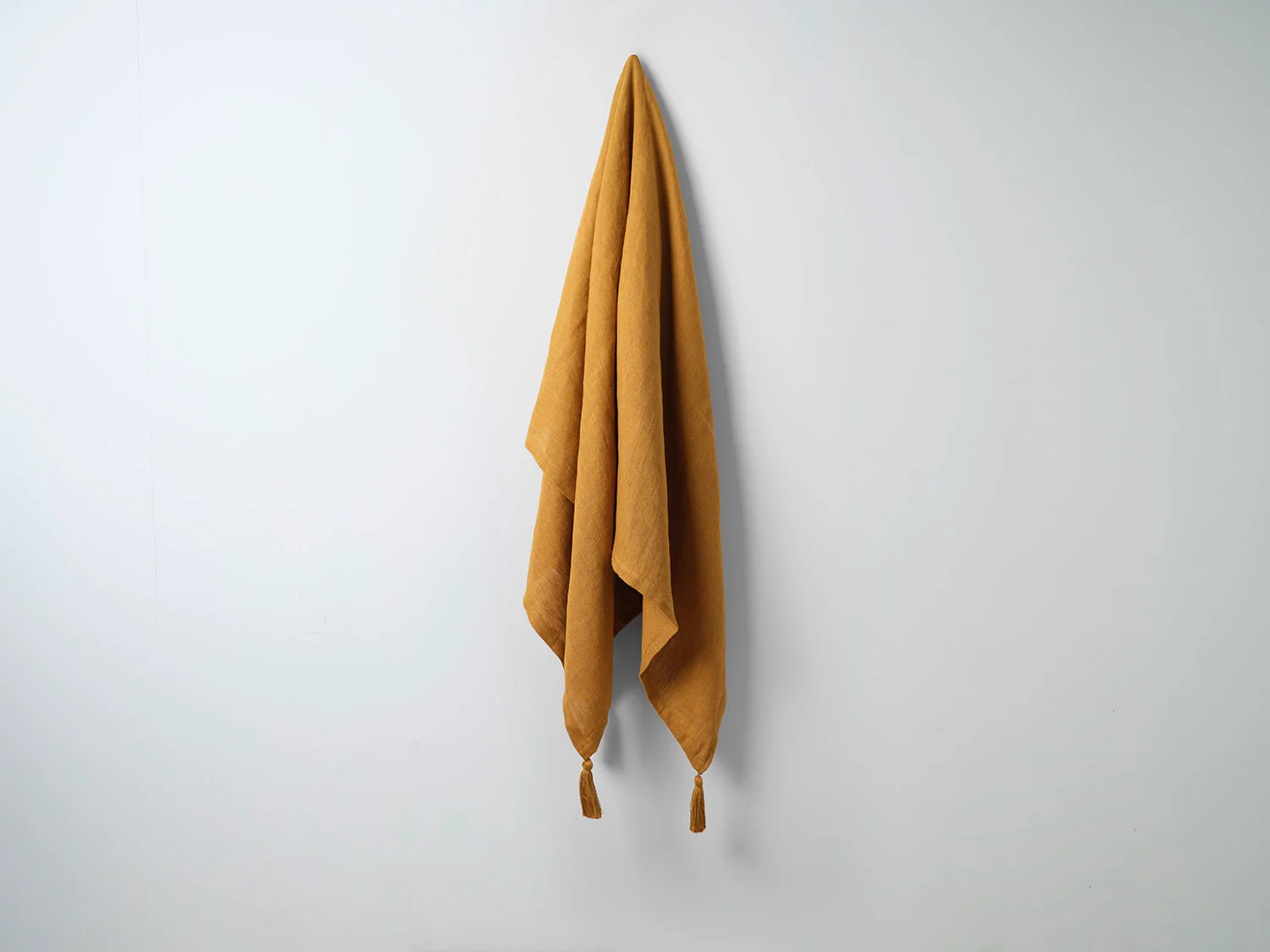 Woven from 100% linen with tassel corners, this lightweight throw adds a stylish pop of colour to any space. Available in Green, Mustard, or Pink.